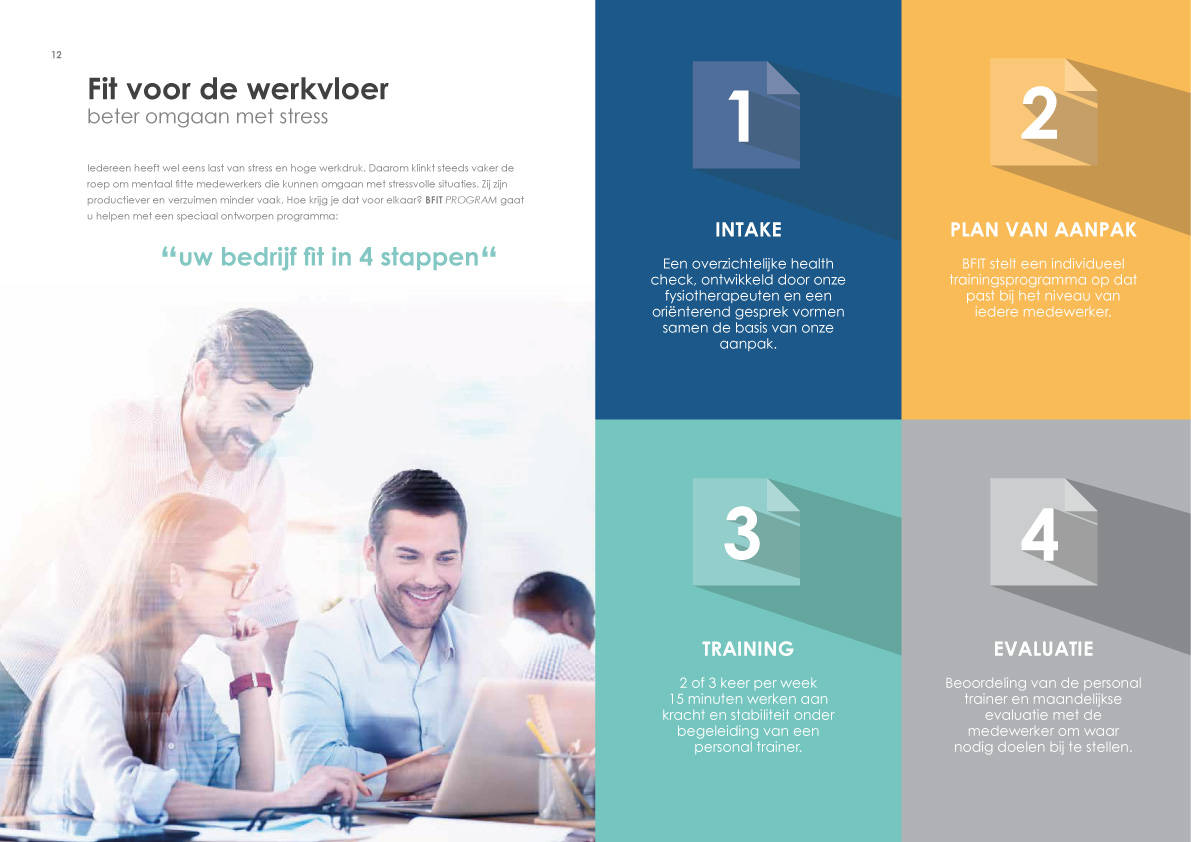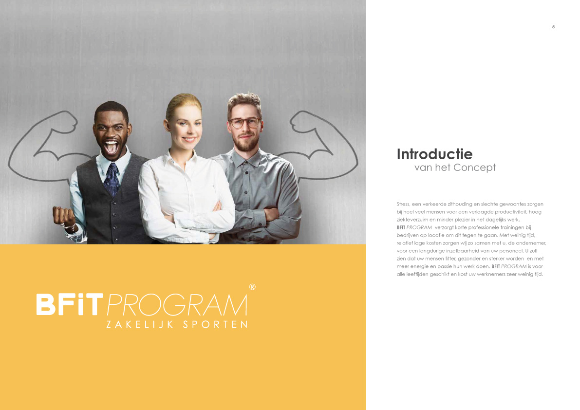 BFIT PROGRAM verzorgt korte professionele trainingen bij bedrijven op locatie om dit tegen te gaan. Met weinig tijd, relatief lage kosten zorgen wij zo samen met u, de ondernemer, voor een langdurige inzetbaarheid van uw personeel. U zult zien dat uw mensen fitter, gezonder en sterker worden en met meer energie en passie hun werk doen. BFIT PROGRAM is voor alle leeftijden geschikt en kost uw werknemers zeer weinig tijd.